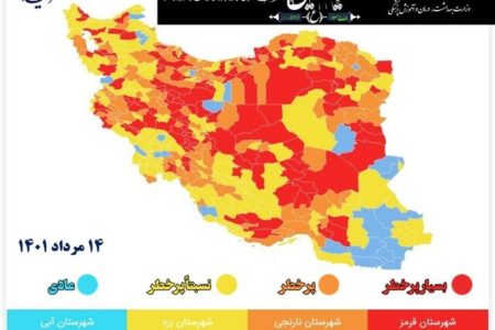 مرکز روابط عمومی و اطلاع رسانی وزارت بهداشت، درمان و آموزش پزشکی، اعلام کرد: در حال حاضر در کشور ۱۳۰ شهر در وضعیت قرمز، ۱۲۹ شهر در وضعیت نارنجی، ۱۵۴ شهر در وضعیت زرد و ۳۵ شهر در وضعیت آبی هستند.